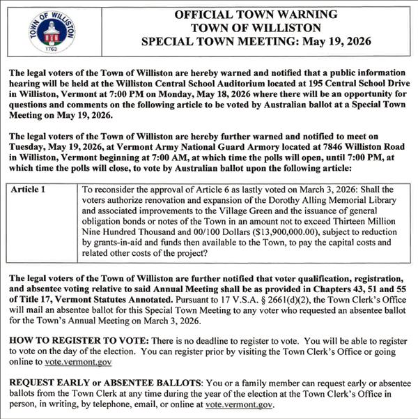 New volunteers are sought to join returning members in this effort. Contact Public Works Director Bruce Hoar by email if interested at bhoar@willistonvt.org.