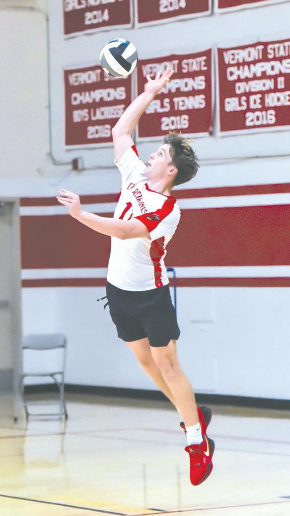 CLOCKWISE (l to r): CVU’s Henry Shrier (1) and Brahm Lasek execute a double block during the Redhawks’ 3-set loss to the Burlington Seahorses on Thursday in Hinesburg. Reid Sadler makes a jump serve.