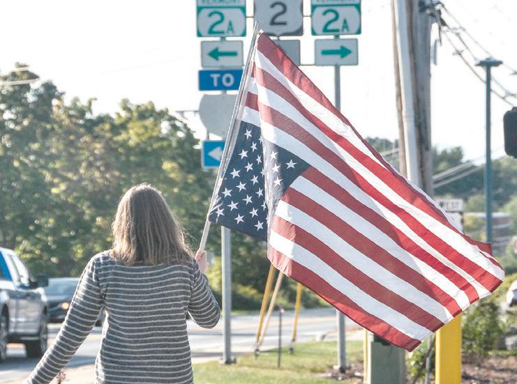 Residents come out for a “Stand Up for Democracy” rally Friday in Taft Corners. The event was organized by Champlain Valley Indivisible, a chapter of the national Indivisible Action political action committee “with a mission to elect progressive leaders, rebuild our democracy, and defeat the Trump agenda,” according to the indivisible.org website.