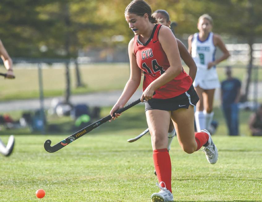 CLOCKWISE (l to r): CVU’s Emery Thompson steers the ball through the defenders during the Redhawks’ 2 - 1 win over the Colchester Lakers on Thursday in Hinesburg. Amelia Oppenheimer takes aim on the ball before sending it off to a teammate. Driving the ball up field Hannah Jones out-races her opponent. Cordelia Thomas brings the ball in on a penalty corner.