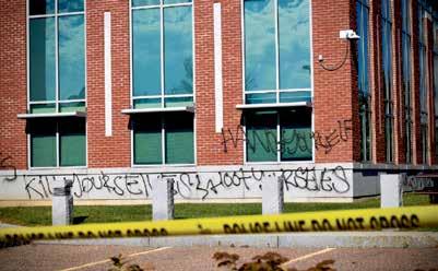 Williston Police Chief Patrick Foley said the building was vandalized between 2:45 a.m. and 3 a.m. Saturday morning. On Sunday, black graffiti was visible around all four sides. It included phrases such as “kill yourselves,” “shoot yourselves” and “hang yourself,” as well as “not safe” and “die.”