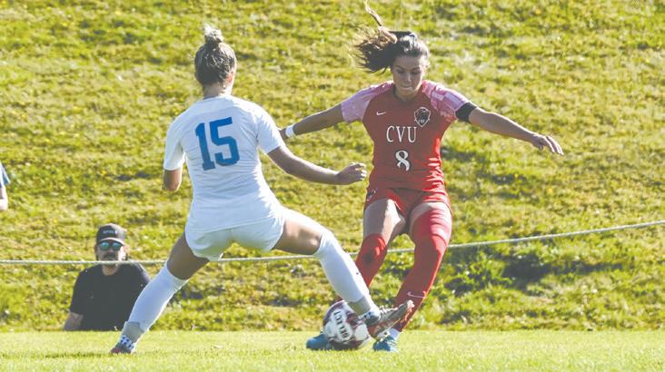 CVU goalie Charles Wallace leaps high for the save during the Redhawks’ 3-0 win over the Colchester Lakers on Friday in Colchester. Stefan Arsovski and Colchester’s Kieran Kadosh battle for ball possession. Henry Galloway makes a pass up the field.