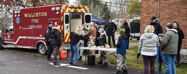 CLOCKWISE (l to r): Thanks to a generous community, the joint food drive organized by the Williston Fire and Police departments on Sunday, combined with a food drive hosted by the Williston Federated Church on Saturday, delivered in a big way. Cadets from the Vermont Civil Air Patrol helped with traffic control and by receiving and organizing the donations.