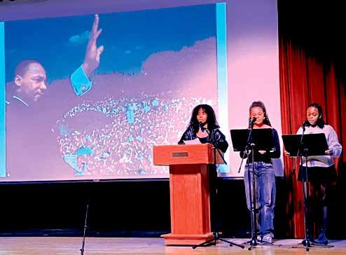 CVU students Malashie Tonoki, Allyson Gutierrez and Lydia Eshete recite the ‘I have a dream’ speech in a Martin Luther King Jr. Day observance Sunday at Williston Central School.