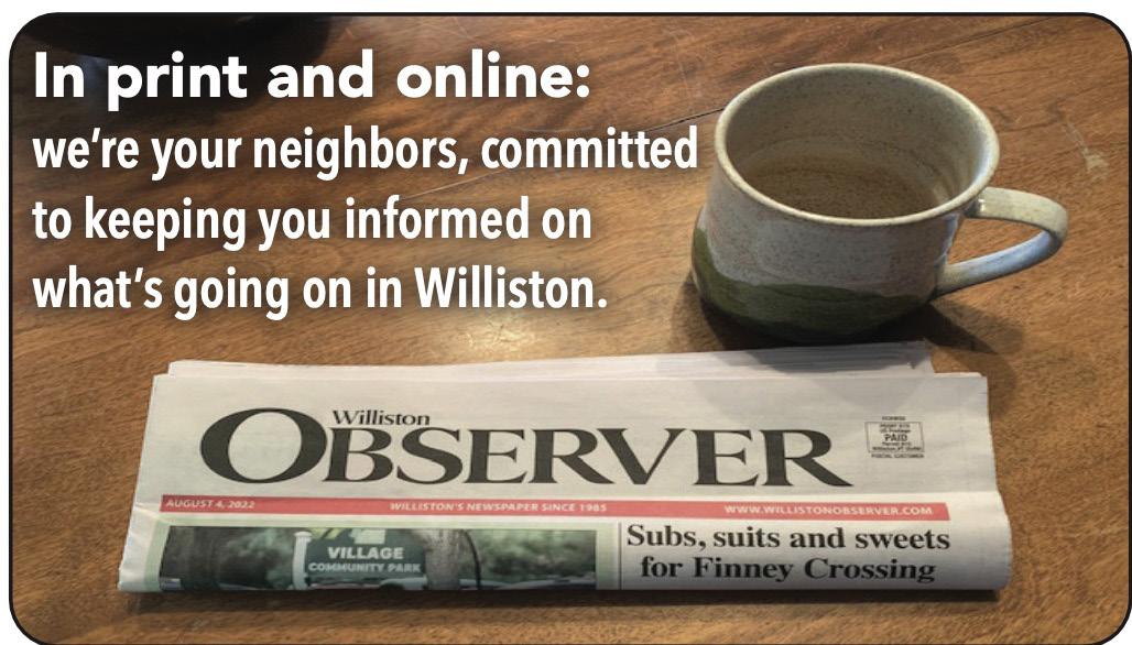 July 6, 2023 Williston Observer Page 3 Breakfast, Lunch, House-made Bread and Pastries Custom-crafted Food & Drink Monday-Friday 7:00 a.m.-3:00 p.m. 400 Cornerstone Drive, Suite 230, Williston (802) 857-5173 • www.willistoncoffeeshop.com WILLISTON COFFEESHOP CLOSED JULY 23-30
