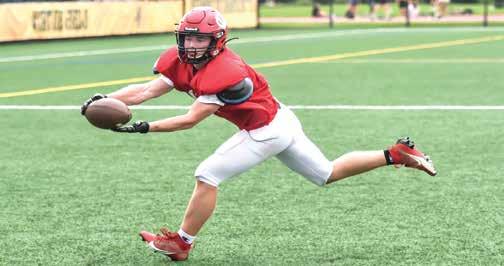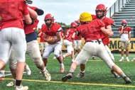 The CVU football running backs, top, work on balance and ball security during a practice at UVM’s Virtue Field last week, and receivers, right, get a chance to show their skills. As a team, above, the players work on line bocking and practice running plays.