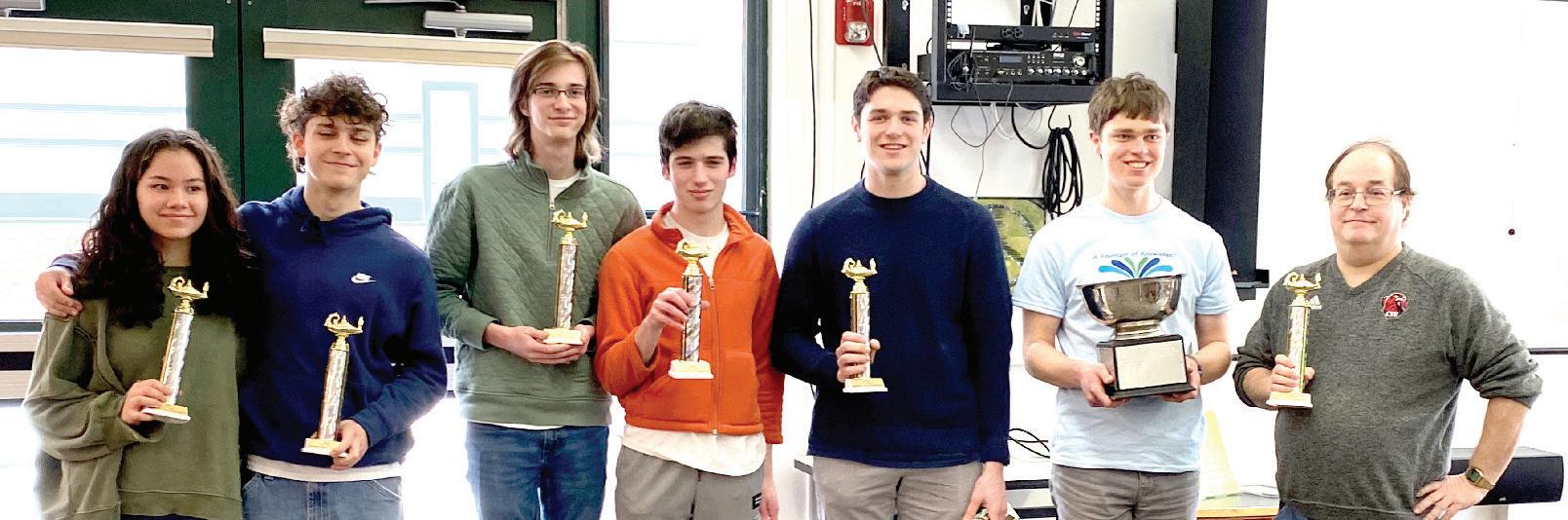 The CVU state championship Scholars’ Bowl team, from left, Zoe Mui, Nolan Sundage, Frank Fidler, Jacob Graham, Colin Ravlin, Elias Leventhal and head coach John Bennett. OBSERVER COURTESY PHOTO