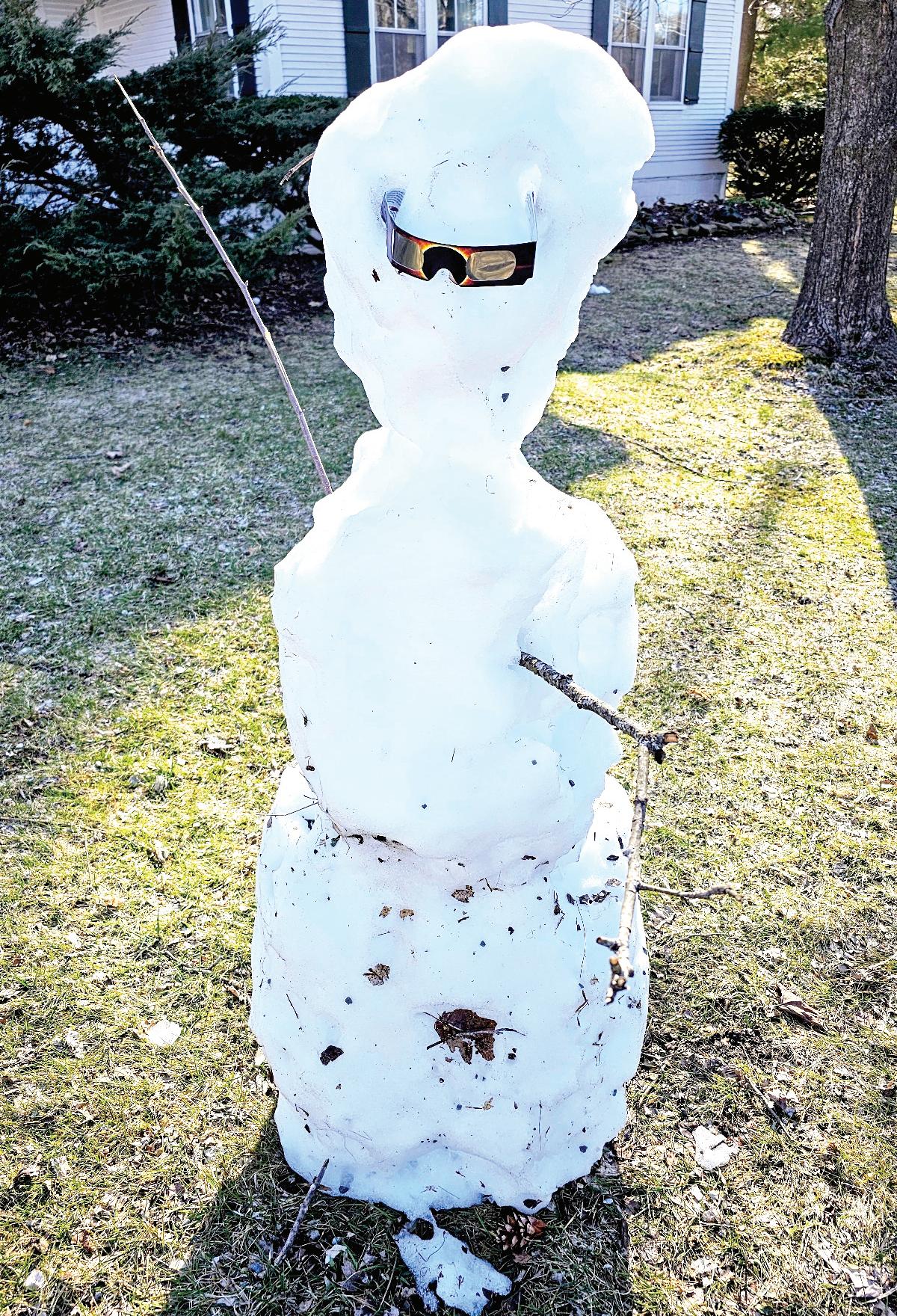 Most likely the last remaining snowman in Williston Village, below, awaits the solar eclipse after last week’s snowstorm gave way to sun. Snow piles up last Thursday, left, as a spring storm blanketed Williston with several inches of wet snow.
