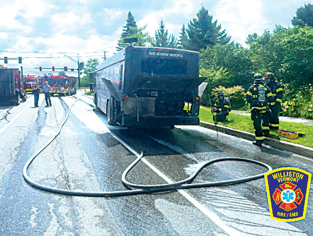 Firefighters arrived on scene about 10:15 a.m., finding smoke and flames emanating from the rear of the bus. Williston Police worked to redirect traffic on Route 2A. The bus had just dropped off passengers at Walmart, its last stop on its route from Burlington, according to the fire department.