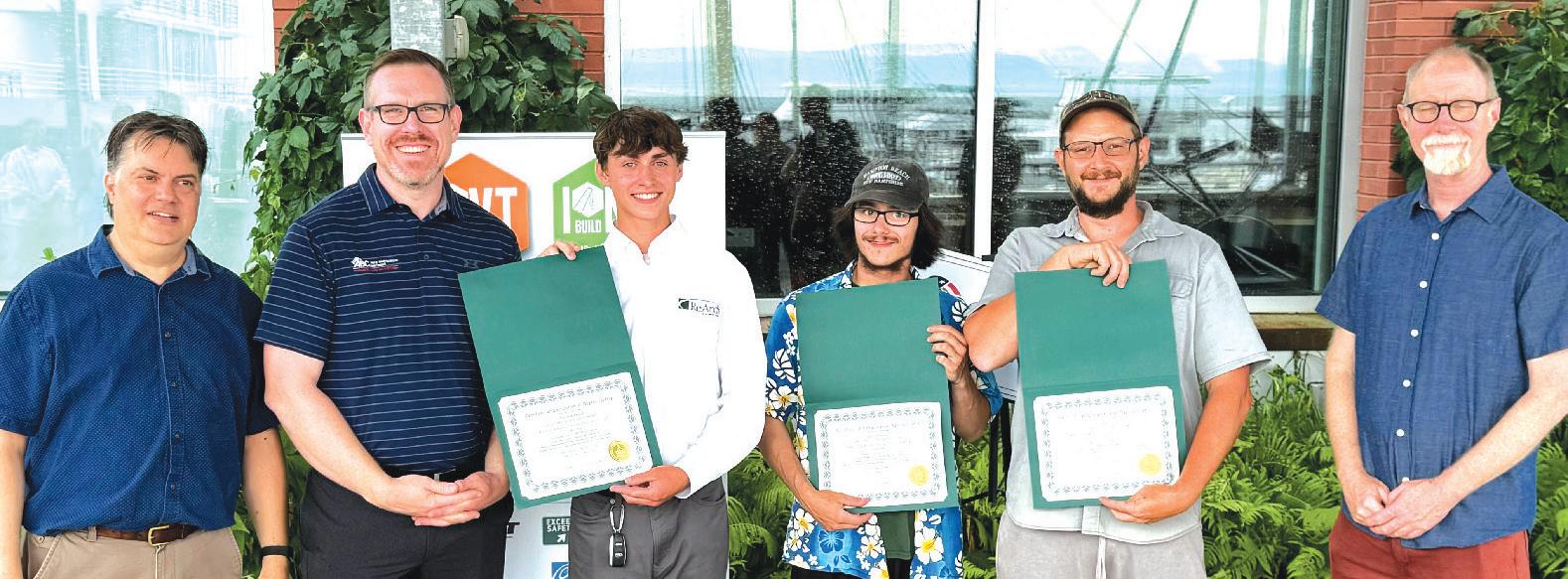 Loaf apprentice Devin Burnell; Bread Loaf apprentice Caley Martin; and ReSOURCE Training Director Andrew Jope celebrate the first graduating class of the Associated Builders & Contractors carpentry apprentice program.