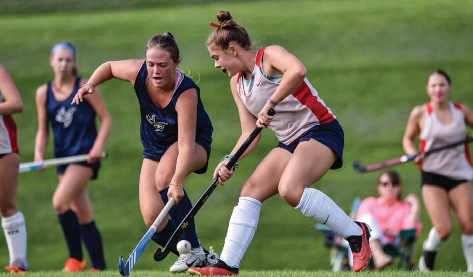 CLOCKWISE (l to r): CVU’s Chloe Tomasi drives the ball up field during the Redhawks’ preseason scrimmage vs. the Essex Hornets in Hinesburg on Friday. Cordelia Thomas gets the ball past an Essex defender. Mackenzie Love defends the ball. Alex Wemple takes a shot on a penalty corner.