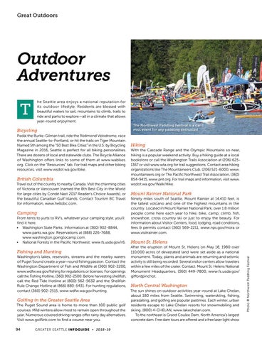 Bicycling Pedal the Burke-Gilman trail, ride the Redmond Velodrome, race the annual Seattle-to-Portland, or hit the trails on Tiger Mountain. Named 5th among the “50 Best Bike Cities” in the U.S. by Bicycling Magazine in 2016, Seattle is perfect for all biking personalities. There are dozens of local and statewide clubs. The Bicycle Alliance of Washington offers links to some of them at www.wabikes. org. Click on the “Resources” tab. For trail maps and other biking resources, visit www.wsdot.wa.gov/bike.