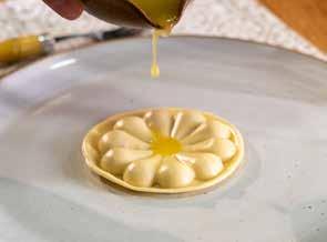 O umami marcante do queijo tulha, resultado de longa maturação, ganha vida com a pimenta preta, que traz calor e aroma na medida. A combinação ressalta a intensidade do queijo sem perder o equilíbrio. Um ravioli de sabor profundo, com personalidade, que surpreende pela delicadeza da massa e pela potência do recheio.