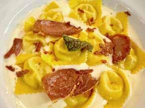 Clássico da casa, o ravioli de brie com mel trufado conquista pelo equilíbrio de sabores e texturas. A massa fresca recheada com queijo brie recebe fonduta de parmesão, toque adocicado do mel trufado e finalização com crisp de presunto cru, uma combinação elegante e deliciosa.