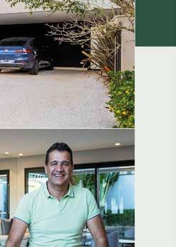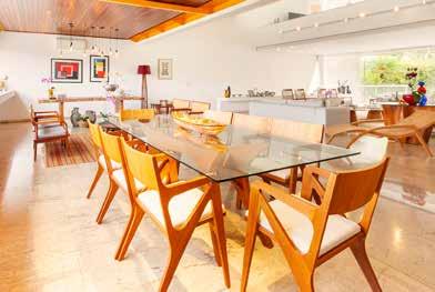 Do outro lado do lazer, e integrado à área interna pelo vão livre, está o espaço gourmet, com uma área reservada que pode servir para a operação de um buffet. Inclusive a proprietária me contou que, além de muitos jantares inesquecíveis, já fez até mesmo um casamento para duzentas pessoas em casa. E como vocês poderão ver em nosso vídeo, com muito espaço.