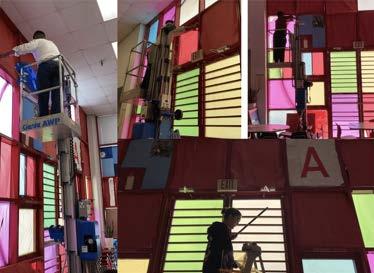 With the help of professor Mr. Lacayo, what started as an individual work turned into a collaborative project that involved the whole class. Using rolls of colored cellophane and an electric lift, we taped the individual pieces to each window panel until the whole glass wall was covered with vibrant colors.