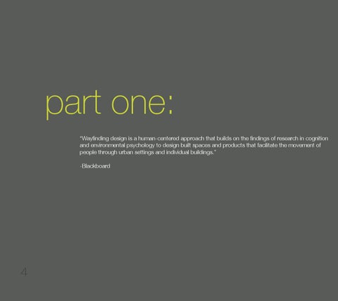 “Wayfinding design is a human-centered approach that builds on the findings of research in cognition and environmental psychology to design built spaces and products that facilitate the movement of people through urban settings and individual buildings.� -Blackboard