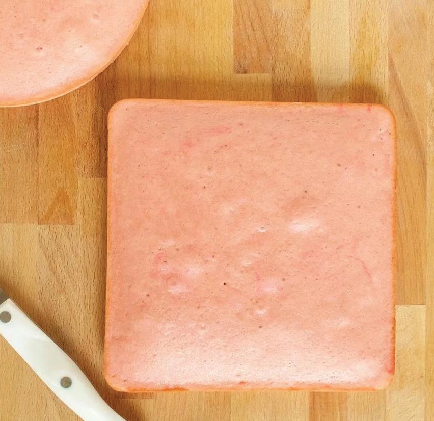 5. Reduce the speed to low. Add the flour mixture alternating with the milk and the strawberry reduction, mixing just until combined. Stop and scrape down the bowl as needed. Mix in a drop or two of food coloring. (Once the cake is baked, the pink color won’t be as vibrant as the batter.) Divide the batter among the two cake pans.