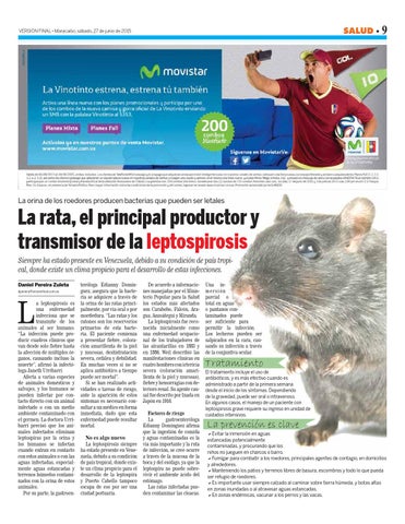 teróloga Edianny Domínguez, asegura que la bacteria se adquiere a través de la orina de las ratas principalmente, por vía oral o por mordedura. “Las ratas y los ratones son los reservorios primarios de esta bacteria. El paciente comienza a presentar fiebre, coloración amarillenta de la piel y mucosas, deshidratación severa, cefálea y debilidad. En muchas veces si no se aplica antibiótico a tiempo puede ser mortal”. Si se han realizado actividades o tareas de riesgo, ante la aparición de estos síntomas es necesario consultar a un médico en forma inmediata, dado que esta enfermedad puede resultar mortal. No es algo nuevo La leptospirosis siempre ha estado presente en Venezuela, debido a su condición de país tropical, donde existe un clima propicio para el desarrollo de la leptospira y Puerto Cabello tampoco escapa de eso por ser una ciudad portuaria.