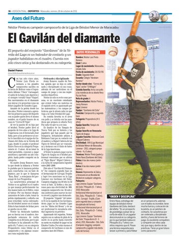 Ordenado y disciplinado Jenny Romero, madre de Néstor, apunta que su hijo es ordenado y disciplinado en sus cosas, además de ser meticuloso en el campo de juego y con sus implementos deportivos. Néstor no sólo es recto como persona, es un excelente estudiante que eximió todas sus materias en el segundo nivel, es apasionado por las matemáticas y los campos petroleros, que le atraen cada vez que viaja a la Costa Oriental del Lago. Su comida favorita es el arroz con pollo y se deleita con las mandocas que prepara su abuela Nery Paz cada vez que va a su casa. Es fanático de los Yanquis de Nueva York por su historia y los jugadores que han pasado por la franquicia. Actualmente admira a Robinson Canó por su contactó con el madero y a Miguel Cabrera de los Tigres de Detroit por ser venezolano y destacar con el título de bateo de la Liga Americana. A Néstor le gustaría jugar con los Tigres de Aragua en el béisbol profesional venezolano por su afición al “Tigre Mayor” Miguel Cabrera y a la racha de campeonatos logrados entre 2003 -2009. Este año el “Gavilán del Diamante” fue campeón segunda base en el Invitacional de Carvajal, Trujillo y logró tres menciones en la Liga Limenor con Gavilanes del Zulia: Campeón slugging con 30 hits en 33 veces al bate, 12 dobles y dos jonrones para una efectividad de .909, campeón campocorto con 32 outs y una asistencia para marcar un nuevo récord y jugador más destacado. El pequeño “Gigante” del número 51 en la espalda de los Gavilanes, desea jugar en las Grandes Ligas con los “Mulos del Bronx” y de no ser profesional le encantaría estudiar ingeniería en petróleo. Apasionado del reguetón, Néstor seguirá con su cadena de plata de la suerte en su pecho hasta convertir su sueño en realidad de jugar en los Estados Unidos. Por estas razones el campocorto de Gavilanes es uno de nuestros Ases del Futuro.