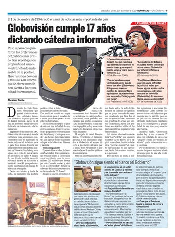 Globovisión cumple 17 años dictando cátedra informativa Paso a paso conquistaron las preferencias del público más crítico. Sus reportajes en profundidad suelen mostrar el lado indeseable de la política. Han resistido bombas y multas. Las amenazas de cierre mantienen alerta a la comunidad internacional. Abraham Puche (LUZ 2002) apuche@versionfinal.com.ve