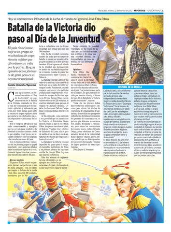 ada 12 de febrero, en Venezuela se celebra el “Día de la Juventud”, en conmemoración de la Batalla de la Victoria, realizada en 1814, la cual fue comandada por el entusiasta, optimista y vehemente, general José Félix Ribas, quien ante la escasez de tropas regulares, tuvo que apelar a los estudiantes sin estar preparados en el manejo de las armas. Hoy se cumplen 199 años de esa fecha conmemorable y ejemplar, que ha servido para rendirle a la juventud un reconocimiento a todo lo que significa el ser joven, ser luchador, combativo y ser ese impulso a las transformaciones del país. Hoy en día los criterios y opiniones de los jóvenes juegan un papel importante, pues generan debates sobre los distintos tópicos de la vida, en donde logran instruirse y sumergirse en todo el acontecer del país. Jóvenes mártires El general Ribas reunió un grupo de jóvenes inexpertos en el uso del fusil, armados con el coraje que inspira la defensa de la patria y con ellos, unos mil 500 soldados, marcharon por la Vic-