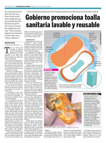 Gobierno promociona toalla sanitaria lavable y reusable blada de esta manera para que el flujo menstrual se concentre aquí y no traspase al otro lado, luego viene otra lámina cruda y el forro”. Antihigiénicas Inmediatamente se generó una polvareda de críticas, repudio, comentarios y hasta chistes sobre esta nueva compresa que retrocede la higiene venezolana a los tiempos de nuestras abuelas, tal como lo dice la misma presentadora. La presidenta del Colegio de Médicos del estado Zulia, Marisela Reverol, no pudo ocultar su indignación: “Esta noticia me llena de mucha indignación... ¡El Gobierno pretende retroceder muchos años luz luego de tantos avances científicos y médicos!”. La galena explicó que este tipo de prenda femenina es totalmente antiséptica. “Por mucho que la usuaria la lave, restriegue y enjuague, siempre presentará elementos bacteriales contaminantes. Hay que recordar que el aparato reproductor femenino es muy delicado y ante cualquier agente patógeno se puede desencadenar en muchas infecciones derivadas”. Reiteró que el Gobierno nacional, en vez de patrocinar piezas artesanales que se remontan a mediados del siglo 19, “debería promover en el país nuevas empresas productoras de toallas sanitarias desechables, antialérgicas y que no impacten al ecosistema”. Precisó Reverol que las mujeres modernas están acostumbradas a una amplia gama de toallas sanitarias, considerando la delgadez, capacidad de absorción, presencia de “alitas” protectoras, cremas suavizantes y hasta fragancias para contrarrestar los malos olores. De igual modo, la doctora Yanine Perozo, directora de Salud de la Alcaldía de Maracaibo, resaltó algunas de las enfermedades que una mujer pudiera sufrir si utiliza toallas reutilizables: dermatitis, vaginitis, micosis y hasta infecciones urinarias “Definitivamente son antihigiénicas. Las mujeres sabemos cuán delicados son nuestros órganos reproductores. Incluso, una leve alteración de PH de la mucosidad vaginal puede desembocar en reacciones desfavorables. No quisiera imaginar cómo será utilizando toallas reciclables, que de sanitarias no tienen aboslutamente nada. ¡Sencillamente es una locura!”.