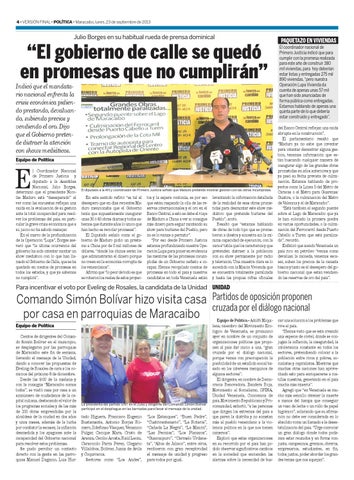 Comando Simón Bolívar hizo visita casa por casa en parroquias de Maracaibo Equipo de Política Cientos de dirigentes del Comando Simón Bolívar en el municipio, se desplegaron por las parroquias de Maracaibo este fin de semana, llevando el mensaje de la Unidad, dando a conocer las propuestas de Eveling de Rosales de cara a los comicios del próximo 8 de diciembre. Desde las 9:00 de la mañana y con la consigna “Maracaibo somos todos”, se visitó casa por casa a un sinnúmero de ciudadanos de la capital zuliana, destacando el valor de los programas sociales y de las más de 200 obras emprendidas por la alcaldesa de la ciudad en dos años y unos meses, además de la lucha por combatir la escasez, la inflación desmedida y los apagones ante la incapacidad del Gobierno nacional para resolver estos problemas. Se pudo percibir un contacto directo con la gente en las parroquias Manuel Dagnino, Luis Hur-