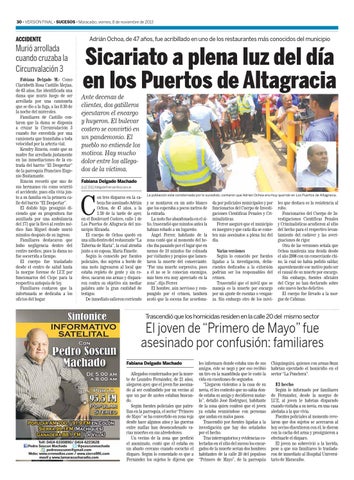 da por policiales municipales y por funcionarios del Cuerpo de Investigaciones Científicas Penales y Criminalísticas. Ferrer aseguró que el municipio es inseguro y que cada día se cometen más asesinatos a plena luz del día. Varias versiones Según lo conocido por fuentes ligadas a la investigación, delincuentes dedicados a la extorsión podrían ser los responsables del crimen. Trascendió que el móvil que se maneja es la muerte por encargo por un ajuste de cuentas o venganza. Sin embargo otro de los móvi-