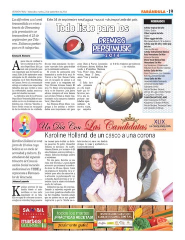 pocos días de celebrar la tercera edición de los Premios Pepsi Music 2014, ya todo está preparado para esta importante gala del talento nacional. Este 24 de septiembre serán entregadas las 61 estatuillas personalizadas en el Hotel Eurobuilding en Caracas. Previo a la ceremonia de entrega se realizará una impactante Alfombra Azul que recibirá a todas las celebridades, bandas, músicos y gente del showbizz nacional. La Alfombra Azul de los Premios Pepsi Music Venezuela 2014 se transmitirá en vivo vía livestream en eonlinletino.com. Caterina Valentino y Rocco Pirillo serán los encargados de dar los detalles de las celebrida-
