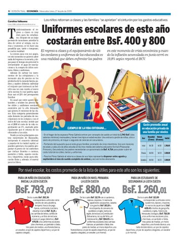 De los cuales BsF. 112,89 corresponden a artículos como cuadernos, lápices, creyones, ½ resma de papel bond; BsF. 428,43 a textos de geografía, castellano, inglés, historia de Venezuela, biología y BsF. 718,59 a los uniformes escolares (dos chemises, un pantalón o falda, tres pares de medias, un mono deportivo, una franela blanca, una bata de laboratorio, un par de zapatos deportivos, un par de zapatos colegiales, un sweater y un morral).