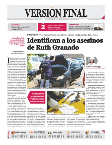 denti car a uno de sus homicidas habría sido el n de la administradora Ruth Beatriz Granado González, de 43 años. Se supo que en un momento de desesperación la mujer creyó que entrar en con anza con los agresores le serviría de ayuda. Aparentemente los sujetos se llamaron por sus nombres cuando estaban en el carro y ella habría identi cado a uno. Eso desataría los demonios de los maleantes que le dieron muerte la noche del miércoles tras apuñalarla y dispararle en dos oportunidades. Los asesinos no salieron airosos. En menos de 24 horas el karma cobró sus deudas. Los homicidas fueron abatidos a las 6:00 p. m. del jueves, en un enfrentamiento con funcionarios del Cuerpo de Investigaciones Cientí cas, Penales y Criminalísticas (Cicpc) con apoyo de efectivos de la Dirección de Inteligencia y Estrategias Preventivas (Diep) del Cpbez. En rueda de prensa, Giovanni González, jefe del Cicpc Zulia, junto a los jefes del Eje de Homicidios y el secretario de Seguridad y Orden Público, Biagio Parisi, dio detalles de las últimas horas de la administradora. Tras un rastreo de telefonía dieron con el paradero de los actuantes en el dantesco hecho. En la mañana de ayer ya los tenían identi cados. Los jefes policiales aseguraron que los abatidos eran: Reny René Carrasquero Reyes, de 19 años, su hermano, Rony René Carrasquero Reyes, de 21, Juan Daniel Zara Labarca, de 17, Leonel David Echeverría Rodríguez, de 22 años y Manuel David Díaz. Cinco de ellos habitantes del barrio Monte Santo, muy cercano al jagüey donde abandonaron