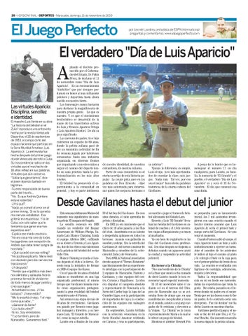 Las virtudes Aparicio: Disciplina, sencillez e identidad. El maestro Luis Verde en su obra "La historia del béisbol en el Zulia" reproduce una entrevista hecha por la revista Venezuela Deportiva, el 25 de septiembre de 1953, al campo corto del equipo nacional que participa en la Serie Mundial Amateur, Luis Aparicio Jr. La entrevista fue hecha después del primer juego donde Venezuela derrotó a Cuba. Su trascendencia radica en las virtudes que el muchacho de 18 años reflejó en sus palabras. Virtudes que aún conserva. "Sabía que ganaríamos" dice el joven Aparicio bañado en lágrimas. -Tú eres responsable de buena parte del triunfo... "No. Es que Andrés Quintero estuvo soberbio." -¿Y tú qué? "Nada, yo cometí el error en el primer inning. Si no lo cometía mis nervios estallaban. Esa gritería era espantosa. Y lo de Cuba, con solo saber que le teníamos que ganar era mas espantoso aún". -Explica ese miedo escénico. "No era cosa mía sino de todos los jugadores con excepción de Andrés que debe tener sangre de horchata." -¿Qué sucedió con ese rolling? "No podría explicarlo. Me le metí con decisión pero los nervios me traicionaron." -¿Y después? "Viendo que el público más bien nos alentaba y aplaudía, hice la promesa formal de olvidarme de todo menos de jugar pelota y creo que jugué." -Yo también lo creo. ¿Y los batazos? ¿Y ese estilo? "Me lo enseñó el viejo. Y el viejo como que sabe..." -¿Ganarán la Serie? "¿Lo duda usted?" -Yo no. Soy venezolano. "Y yo también, pero de Maracaibo. Ganaremos fácil."