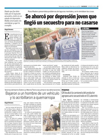 l remordimiento de conciencia, ligado con problemas mentales y problemas de depresión, llevó a Rosa Dominga Madero Navarro, de 19 años, de nacionalidad colombiana, a guindarse con un mecate en el patio de la residencia donde vivía actualmente. Este hecho ocurrió ayer en horas de la madrugada, en la calle 207 del barrio 17 de Diciembre, de la parroquia Domitila Flores del municipio San Francisco, cuando la joven aprovechó que todos dormían para salir al patio, colgar un mecate y suicidarse. Su depresión la llevó a esto. Tener problemas con la justicia fue un factor determinante para que Rosa decidiera suicidarse, ya que sus problemas se agudizaron a principios de este mes, cuando salió de su casa y se perdió, y a los días apareció. Cecilia Gómez, dueña de la residencia donde ocurrieron los hechos y prima de la víctima, comentó que el pasado 5 de febrero los medios de comunicación reseñaron una información donde indicaban que Rosa había fingido un auto secuestro, para zafarse de un