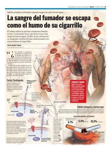 La sangre del fumador se escapa como el humo de su cigarrillo El tabaco altera la química sanguínea drásticamente. Un fumador tiene casi cuatro veces más riesgo de hemorragias. El 66% de las víctimas de un sangrado cerebral del tipo subaracnoideo son consumidores de cigarrillos. Hiram Aguilar Espina (Unica 2001) haguilar@versionfinal.com.ve
