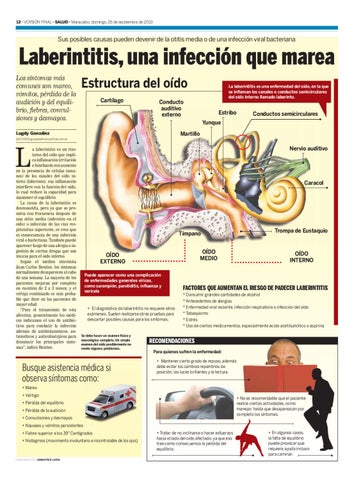 a laberintitis es un trastorno del oído que implica inflamación (irritación e hinchazón con aumento en la presencia de células inmunes) de los canales del oído interno (laberinto); esa inflamación interfiere con la función del oído, lo cual reduce la capacidad para mantener el equilibrio. La causa de la laberintitis es desconocida, pero ya que se presenta con frecuencia después de una otitis media (infección en el oído) o infección de las vías respiratorias superiores, se cree que es consecuencia de una infección viral o bacteriana. También puede aparecer luego de una alergia o ingestión de ciertas drogas que son tóxicas para el oído interno. Según el médico internista Juan Carlos Benites, los síntomas normalmente desaparecen al cabo de una semana. La mayoría de los pacientes mejoran por completo en cuestión de 2 a 3 meses; y el vértigo continuado es más probable que dure en los pacientes de mayor edad. “Para el tratamiento de esta afección, generalmente los médicos indicamos el uso de antibióticos para combatir la infección además de antihistamínicos, antieméticos y anticolinérgicos para disminuir los principales síntomas”, indicó Benites.