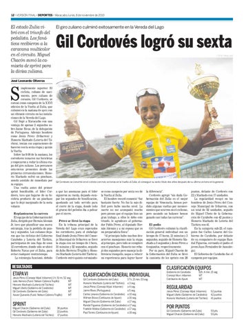 la diferencia”. Cordovés agregó “sin duda Gobernación del Zulia es el mejor equipo de Venezuela, hemos perdido algunas vueltas por inconvenientes que ocurren en el ciclismo, pero sacando un balance hemos ganado casi todas las carreras”. El podio Gil Cordovés culminó la clasificación general individual con un tiempo de 17 horas, 21 minutos y 3 segundos, seguido de Honorio Machado a 3 segundos y Jesús Pérez a 4 segundos, respectivamente. Por su pare, Miguel Chacón de la Gobernación del Zulia se llevó la camiseta de los sprints con 26