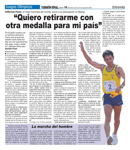 “Quiero retirarme con otra medalla para mi país” “En Ecuador cuentan con un hermano latinoamericano, que al igual que ustedes sueña todos los días con una Latinoamérica más justa, unida y solidaria”. Jefferson Pérez para Versión Final. Ernesto Vera S. En Ecuador el vaivén hipnótico de las piernas de un hombre paraliza a miles de personas de una misma sangre y un mismo hablar… Los expertos del atletismo en el mundo lo llaman “el mejor atleta latinoamericano de todos los tiempos”, otros, los que pueden considerarse sus detractores, ni siquiera opinan porque no tienen argumentos para decir lo contrario. Simplemente está en una galaxia fuera de serie compartida por muy pocos elegidos. Y así, el ecuatoriano Jefferson Pérez, el triplecampeón mundial de marcha y campeón olímpico en Atlanta 96, expresa su técnica inigualable y hace del ombligo del mundo una tierra referencial para este tipo de disciplina. Sus 34 años demandan un descanso por lo que ha dicho que Beijing será su última carrera, pero no por ello ha bajado su calidad competitiva que durante 2008 regaló nuevos triunfos a su palmarés de salón de la fama. —Usted ha sido un ejemplo para varias generaciones de deportistas latinoamericanos. ¿Qué se siente tener tanta responsabilidad sobre sus hombros? —Para mí es gratificante escuchar sus palabras ya que esto me lleva a pensar que los 20 años de carrera no fueron en vano. Es un honor Jefferson Leonardo Pérez Quezada nació en El Vecino, uno de los barrios más tradicionales de Cuenca, en Ecuador, el primero de julio de 1974. Se graduó de Ingeniero Comercial en la Universidad de Azuay (Ecuador) donde también consiguió un Máster en Administración de Empresas. A finales de 2007 fue elegido por los medios
