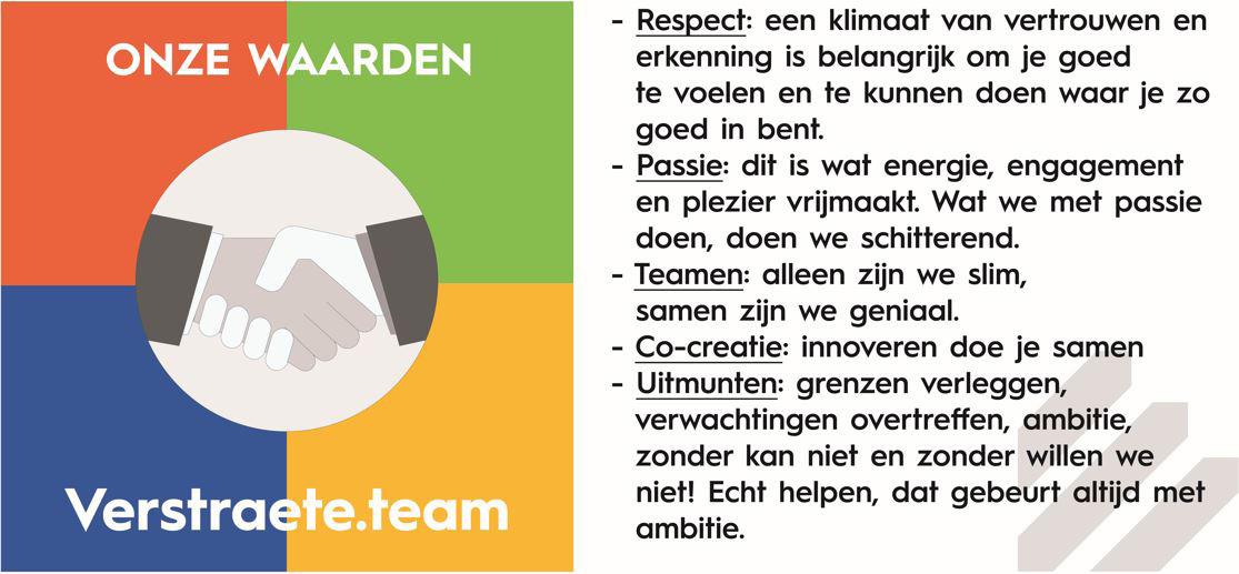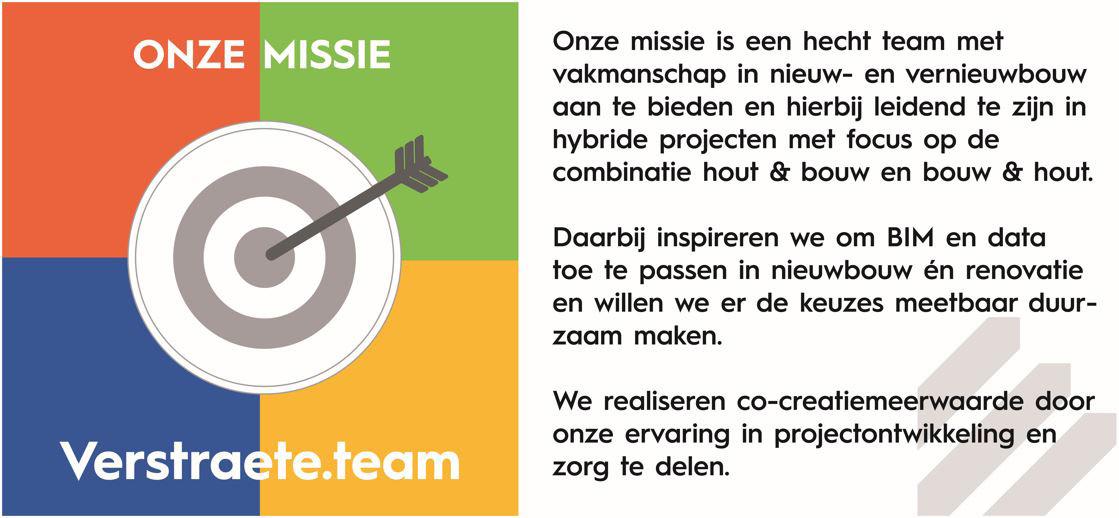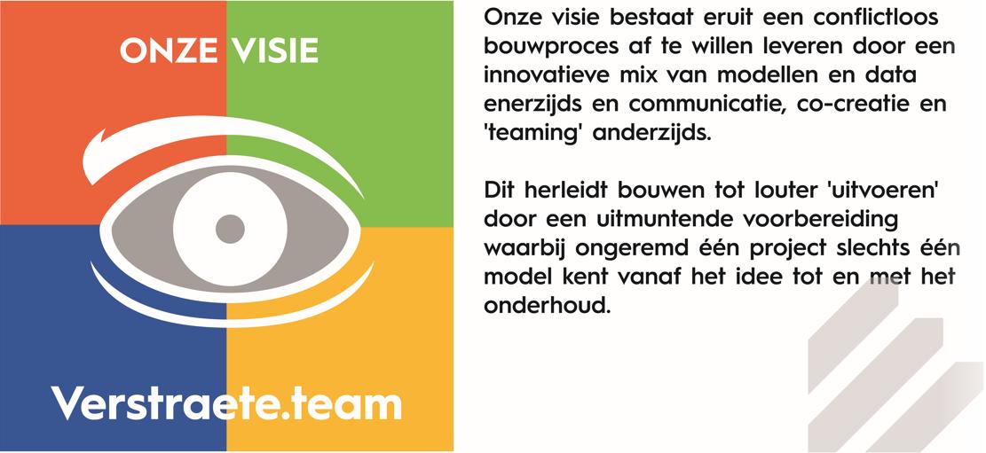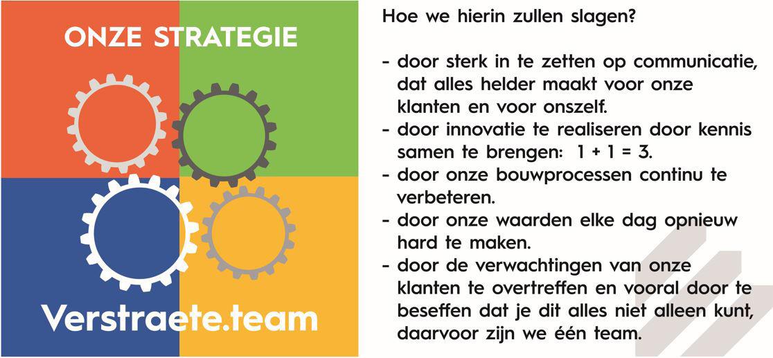 Om de verschillende expertisedomeinen van Verstraete groeipotentieel te geven, werkt de groep sinds kort onder de naam Verstraete.team, met als business units Verstraete.bouw, Verstraete.hout, Vestraete.immo en Verstraete.zorg. Een grote stap naar een nóg sterkere professionalisering in de toekomst.