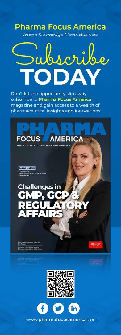 Every issue of Pharma Focus America magazine is a powerful dose of information and knowledge – filled with original and undiluted content. Written by the best brains in pharma industry, the magazine offers timely business insights and articles on cutting-edge technologies. Subscribe now to get your doses regularly. Email: subscriptions@pharmafocusamerica.com www.pharmafocusamerica.com