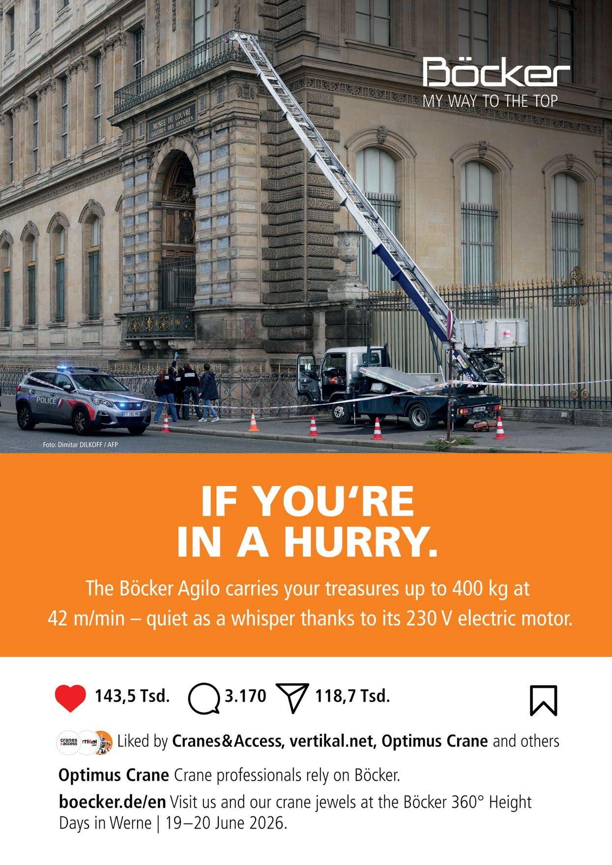 The product in question was a truck mounted Böcker furniture hoist, which achieved global exposure when it was involved earlier this month in the jewel heist at the Louvre in Paris. Thieves used the lift to gain access to a balcony and break into a window not covered by CCTV security cameras. They were inside the building for four minutes during which time they stole the jewels and then rode the platform down to waiting scooters to make their escape. The whole thing took less than seven minutes.