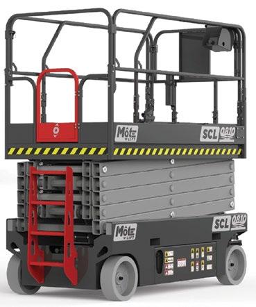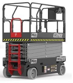 The three slab electric scissor lifts are the 27ft SCL0810, 33ft SCL1012 and 39ft SCL1214 with a working heights of 10, 12 and just under 14 metres respectively. All three have a maximum platform capacity of 460kg, an overall width of 1.15 metres and overall length of 2.41 metres. Overall height with guardrails up is 2.4, 2.5 and 2.64 metres. Folding guardrails are standard, but only the SCL0810 folds down to less than two metres. Overall weights range from 2,600kg to just over 3,000kg. articulated boom lifts