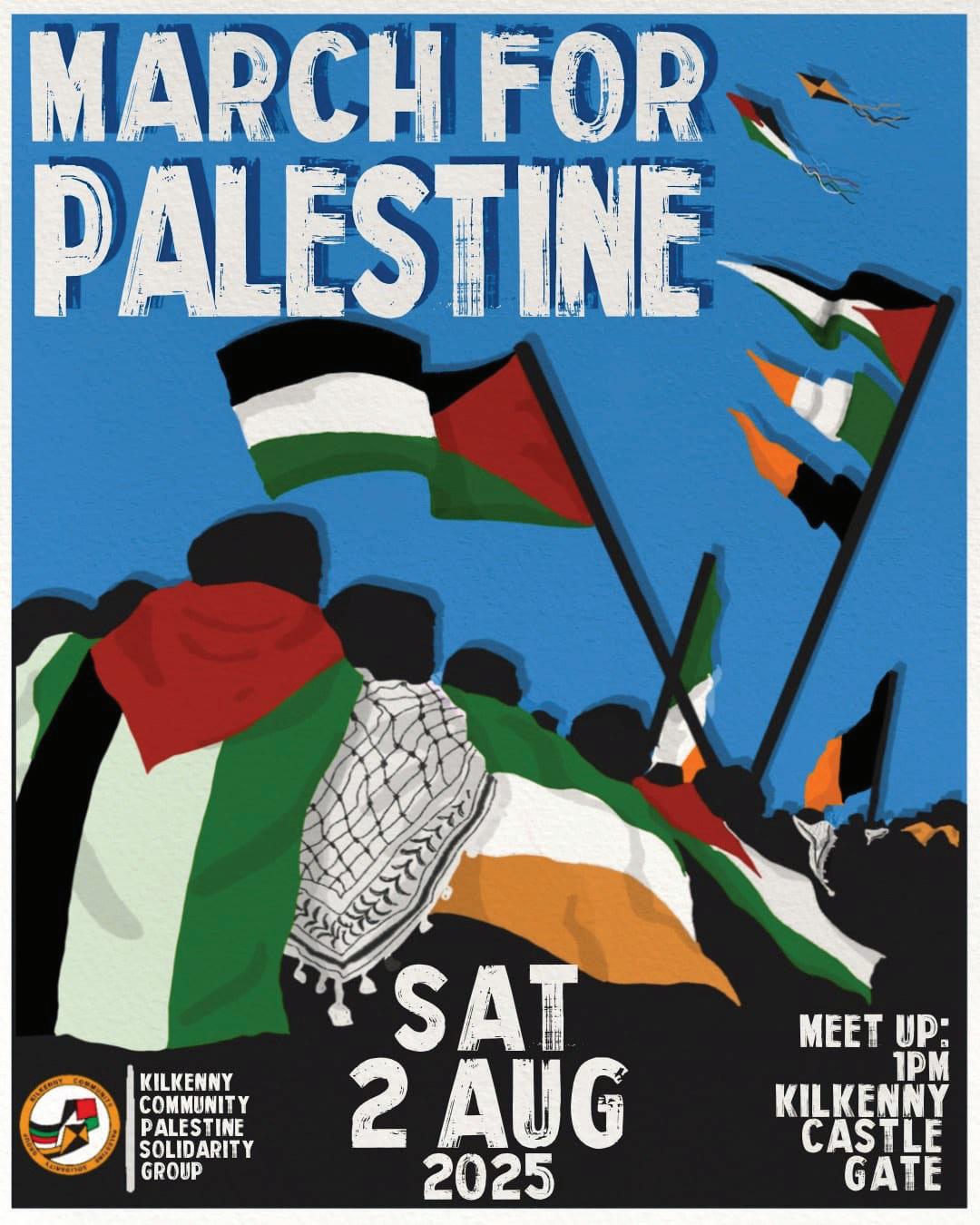 “STAND FOR PEACE” March for Palestine on Saturday, 2nd August 2025. Throughout the world people are heartbroken and outraged by the suffering in Gaza and Palestine. One action we can take is to come together in peaceful solidarity with the people of Palestine. You are kindly invited to join the Kilkenny Community Palestine Solidarity Group for a ‘March for Palestine’ on Saturday, August 2nd. at 1.00p.m, beginning at the Kilkenny Castle Main Gates. In the words of Pope Leo XIV – “From the Gaza Strip, we hear rising ever more insistently to the heavens, the cries of mothers and fathers who clutch the lifeless bodies of their children”