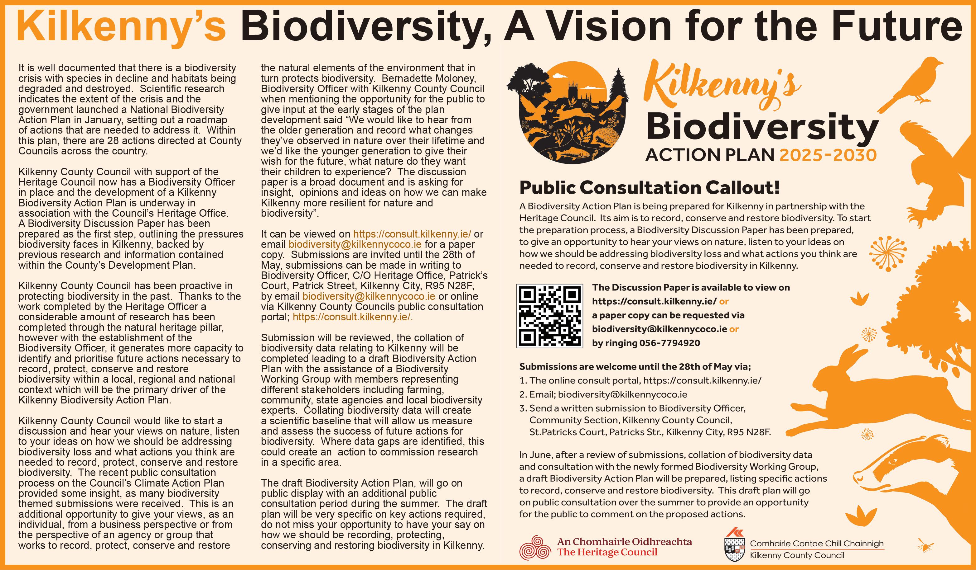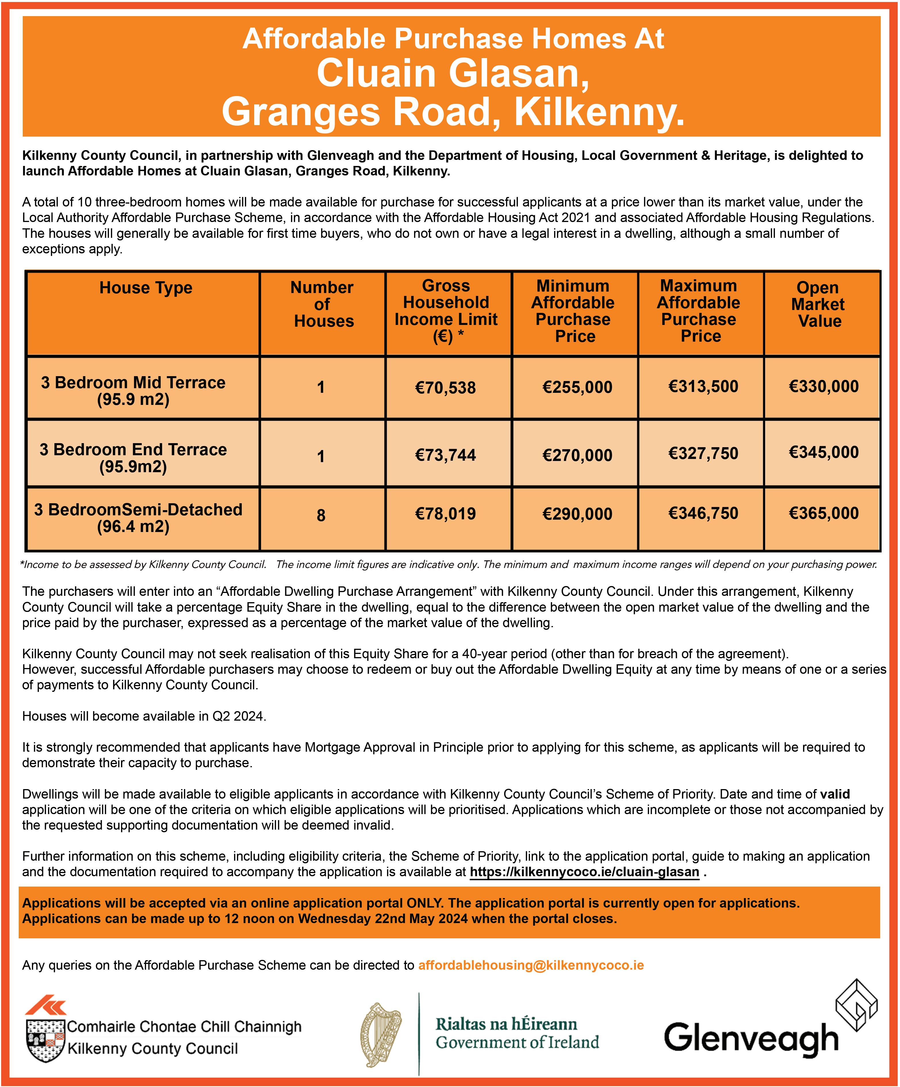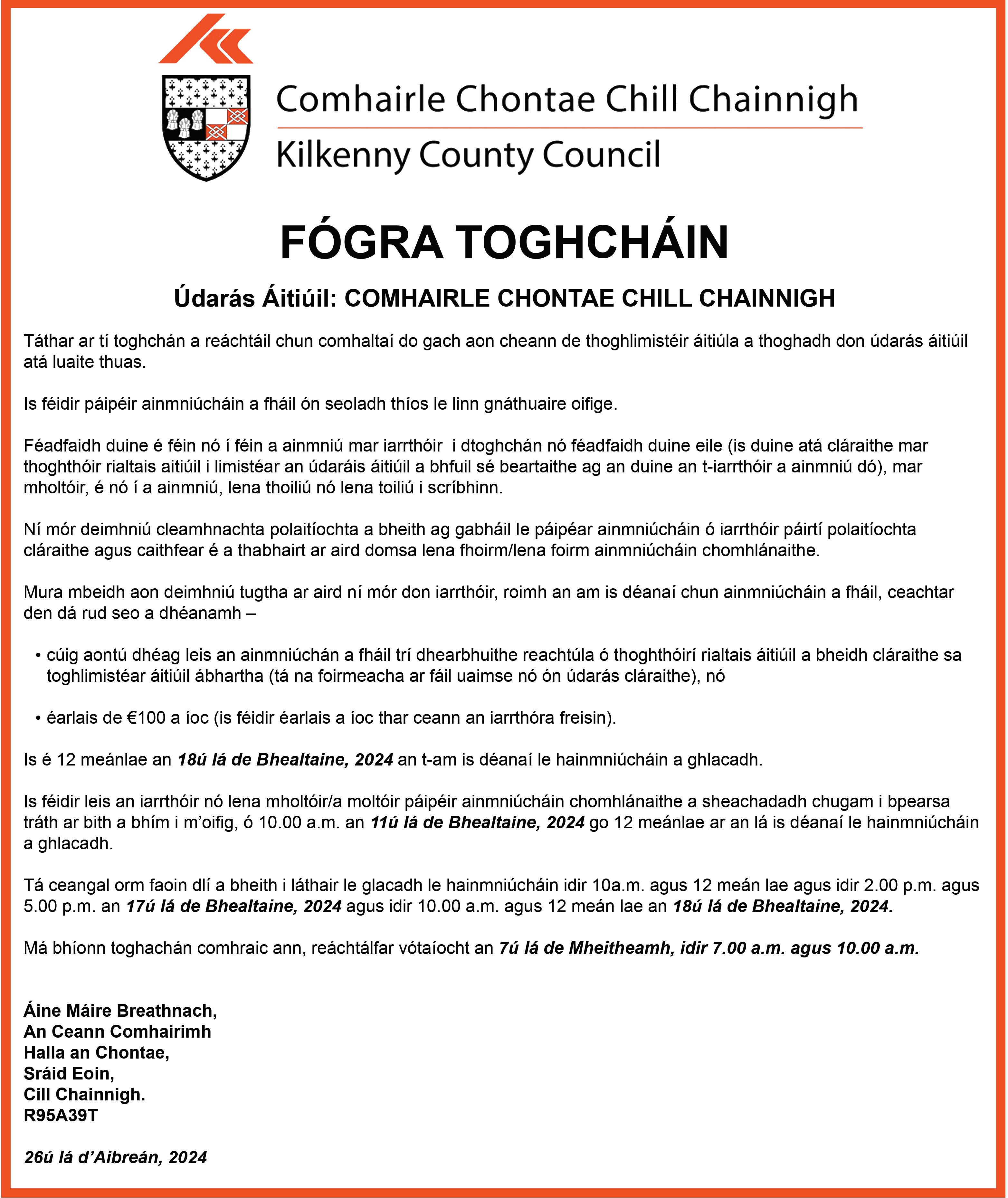 The planning application may be inspected, or purchased at a fee not exceeding the reasonable cost of making a copy, at the offices of the Planning Department, Kilkenny County Council, County Hall, John Street, Kilkenny, during its public opening hours 9 a.m.- 1.00 p.m. and 2.00 p.m. – 4.00 p.m. Monday to Friday, and a submission or observation in relation to the application may be made to the Planning Authority in writing on payment of the prescribed fee (€20.00) within the period of 5 weeks beginning on the date of receipt by the Authority of the planning application, and such submissions or observations will be considered by the Planning Authority in making a decision on the application. The Planning Authority may grant permission subject to or without conditions, or may refuse to grant permission.