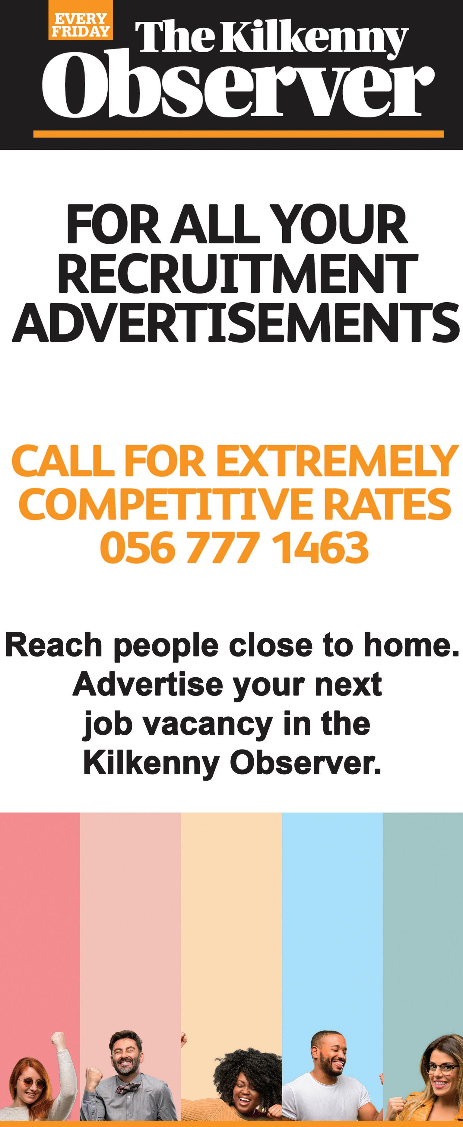 Applications are invited for the vacant tenancy of a onebedroom house at St Kieran’s Place, Urlingford. To be eligible to apply you must be on the Kilkenny County Council Housing list. Applications are available from the Centre.