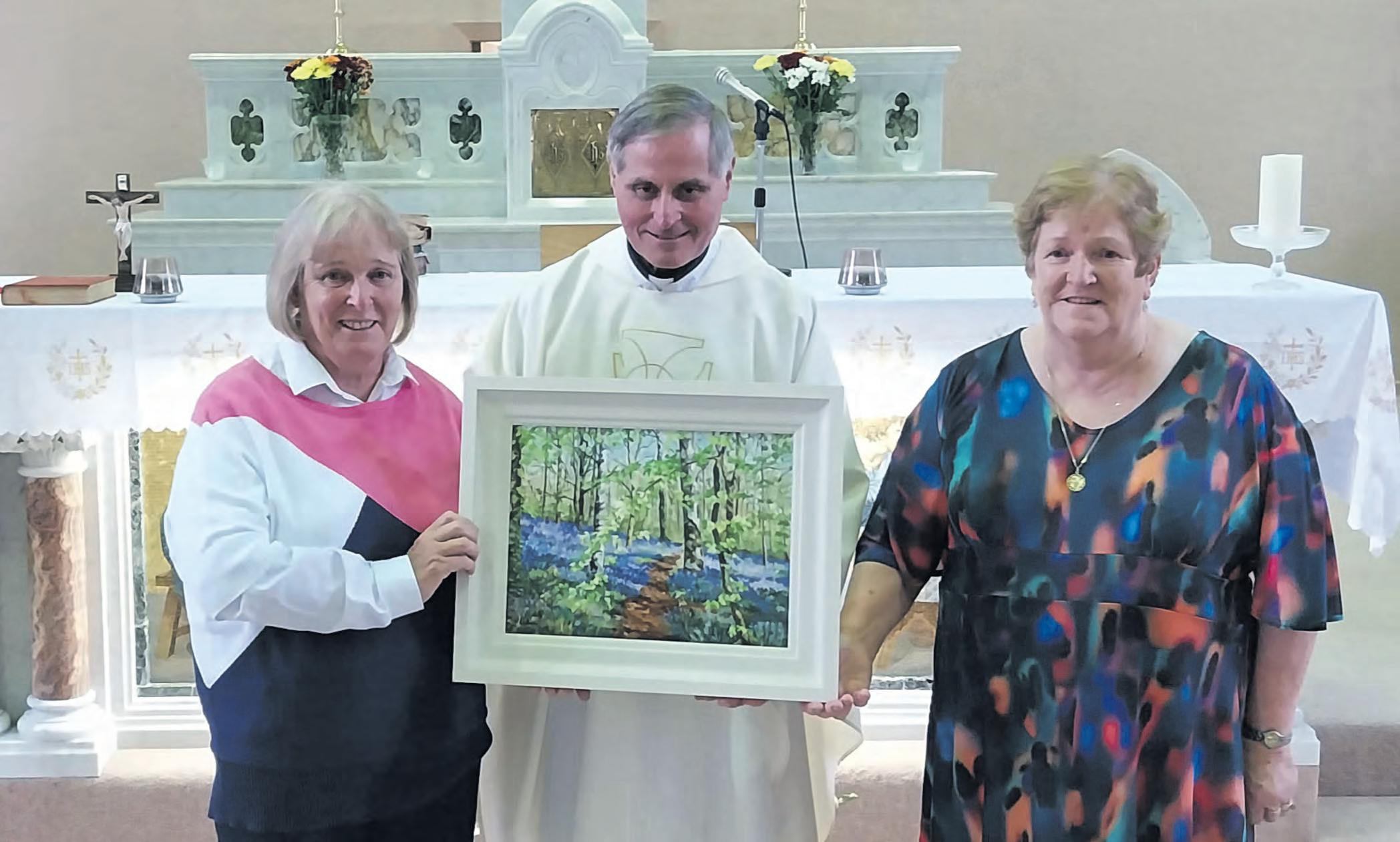 Following his recent final Mass before departing Conahy Parish, Fr. Willie Hennessy, P.P., was presented with farewell gift of a landscape painting of the bluebells in Jenkinstown Wood from local artist Susan Keohane by Eileen Gunner and Teresa Dollard on behalf of the parishioners of Conahy.