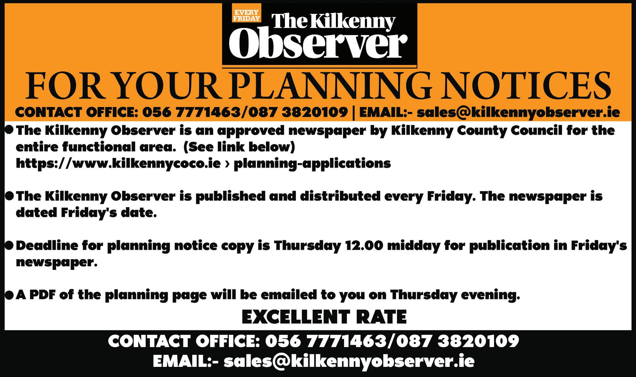 The planning application may be inspected, or purchased at a fee not exceeding the reasonable cost of making a copy, at the offices of the Planning Department, Kilkenny County Council, County Hall, John Street, Kilkenny, during its public opening hours 9 a.m.- 1.00 p.m. and 2.00 p.m. – 4.00 p.m. Monday to Friday, and a submission or observation in relation to the application may be made to the Planning Authority in writing on payment of the prescribed fee (€20.00) within the period of 5 weeks beginning on the date of receipt by the Authority of the planning application, and such submissions or observations will be considered by the Planning Authority in making a decision on the application. The Planning Authority may grant permission subject to or without conditions, or may refuse to grant permission.