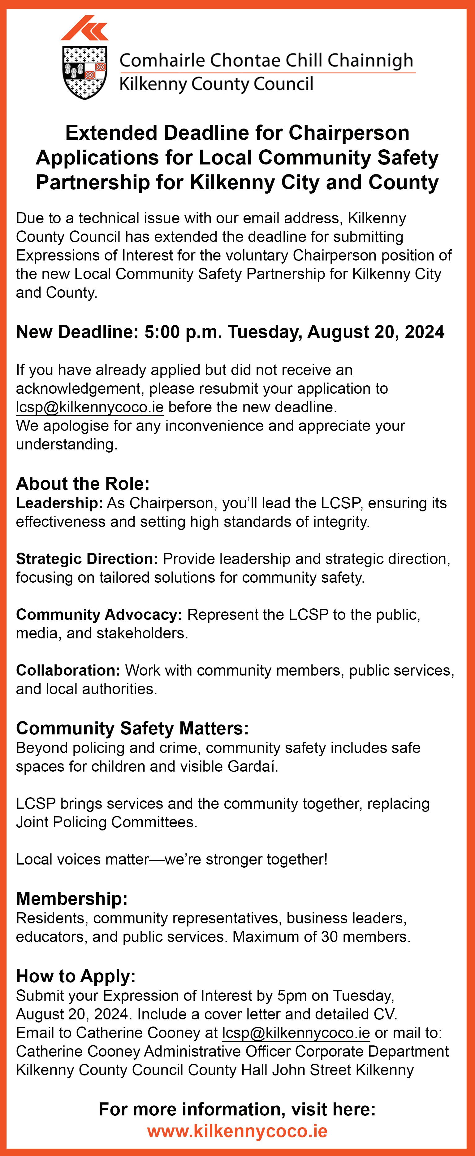 The planning application may be inspected, or purchased at a fee not exceeding the reasonable cost of making a copy, at the offices of the Planning Department, Kilkenny County Council, County Hall, John Street, Kilkenny, during its public opening hours 9 a.m.- 1.00 p.m. and 2.00 p.m. – 4.00 p.m. Monday to Friday, and a submission or observation in relation to the application may be made to the Planning Authority in writing on payment of the prescribed fee (€20.00) within the period of 5 weeks beginning on the date of receipt by the Authority of the planning application, and such submissions or observations will be considered by the Planning Authority in making a decision on the application. The Planning Authority may grant permission subject to or without conditions, or may refuse to grant permission.