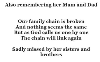 From your loving daughters and sons, Ann, Susan and Elizabeth, Paddy Brendan, Andrew, Gareth, David, Thomas and also Edward (RIP), your grandchildren, great grandchild, nieces and newphews, sisters and brothers.