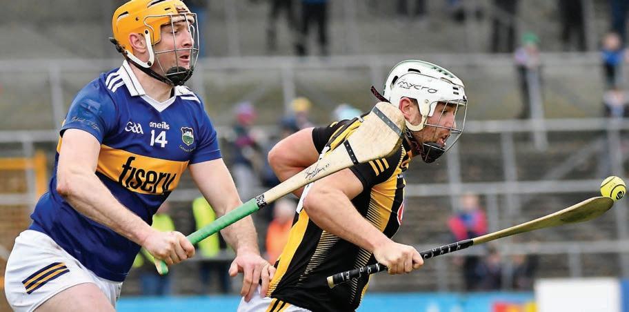 metres. e men in black and amber needed goals and they got a major of their own on 58 minutes. Billy Ryan took a superb catch before going on a strong run towards the Tipp goal. He had the presence of mind to send a pass towards Alan Murphy wo intelligently icked the sliotar in the direction of Mossy who gathered before ri ing past Barry Hogan in the Tipp goal. e de cit was now ve points. e large home crowd got a little louder. Noel McGrath sent over his second point of the day. Billy Drennan then nailed a free from his own half, then one from slightly closer to the Tipp target. Derek Lyng’s side were dealt a blow when Alan Murphy. had to leave the eld having failed to recover from the knock he took when assisting the Cats goal. Drennan then slotted another free, the gap now down to four. Carlow ref Murphy, then gave a veery soft free to the Premier and Jason Forde made no mistake. Forde hit the next two points of the game. His rst e ort a stunning sideline cut, the second an easy point after a poor restart from Kilkenny.
